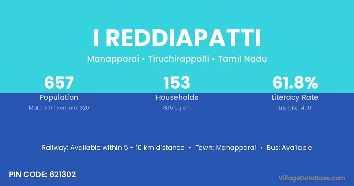 I Reddiapatti village has a total population of 657 people, of which 331 are males and 326 are females.