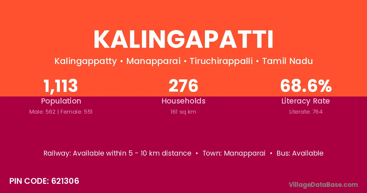Kalingapatti village has a total population of 1,113 people, of which 562 are males and 551 are females.