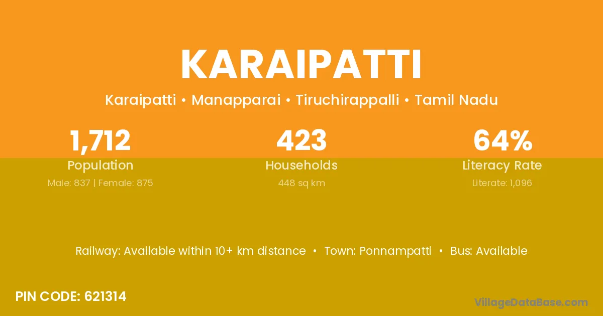 Karaipatti village has a total population of 1,712 people, of which 837 are males and 875 are females.