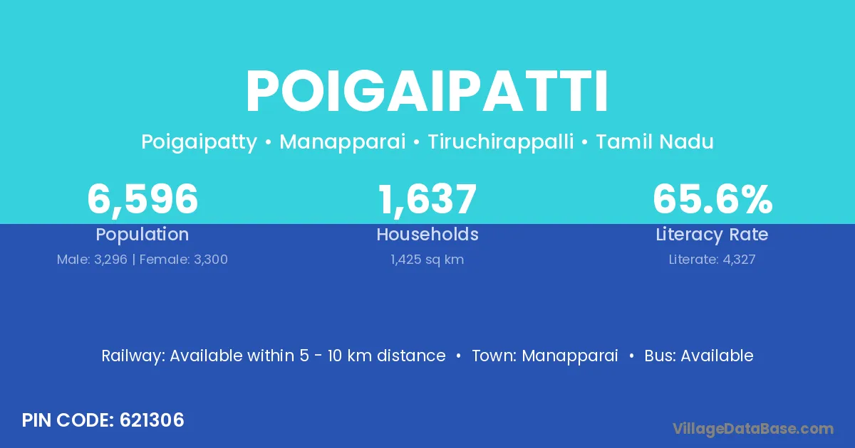 Poigaipatti village has a total population of 6,596 people, of which 3,296 are males and 3,300 are females.