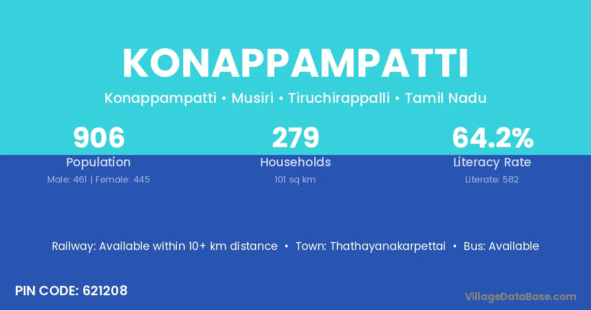 Konappampatti village has a total population of 906 people, of which 461 are males and 445 are females.