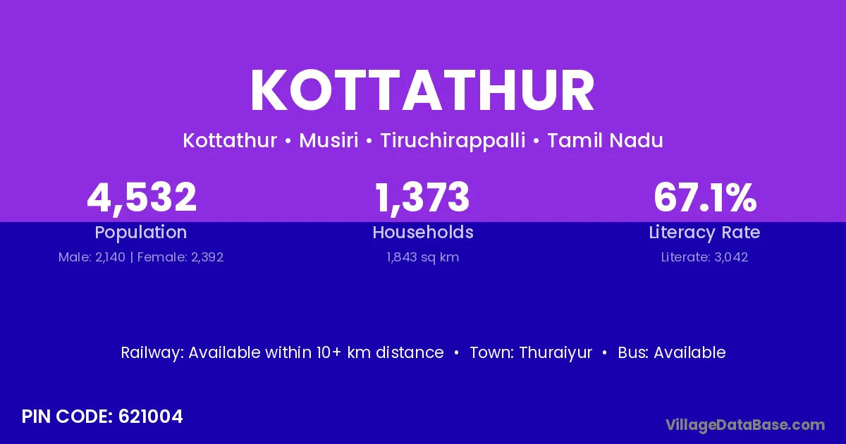 According to Census 2011 information, the village code of Kottathur village is 621004.