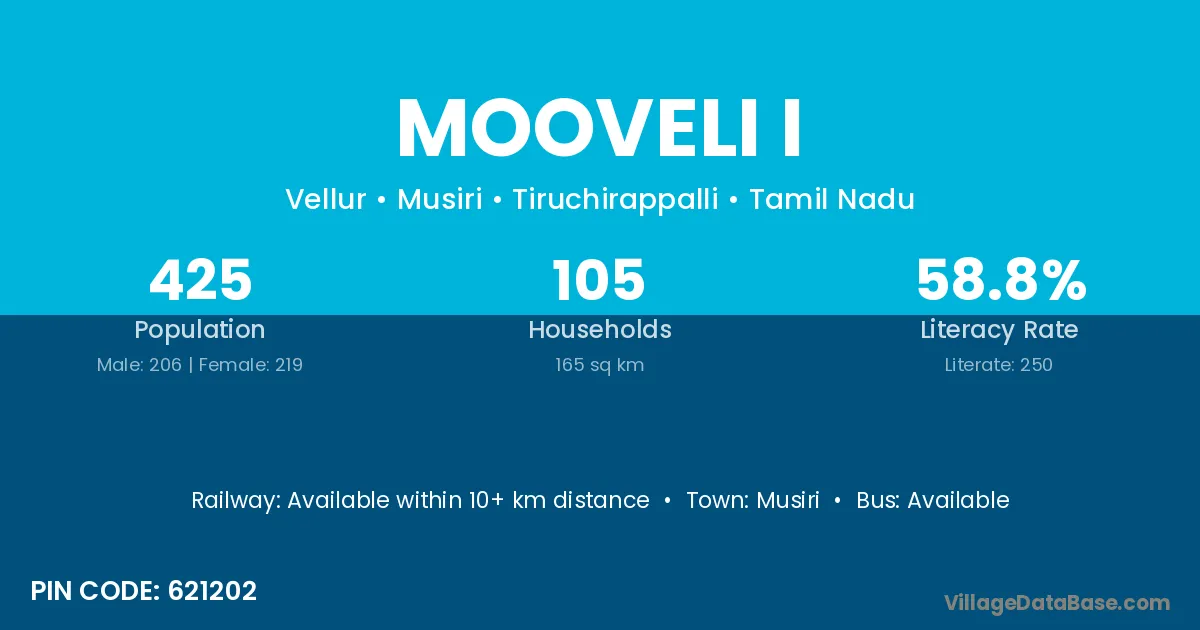 Musiri is the nearest town to Mooveli I village for major economic activities