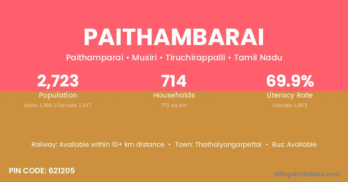 Paithambarai village has a total population of 2,723 people, of which 1,386 are males and 1,337 are females.
