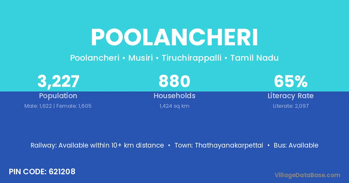 Poolancheri village has a total population of 3,227 people, of which 1,622 are males and 1,605 are females.