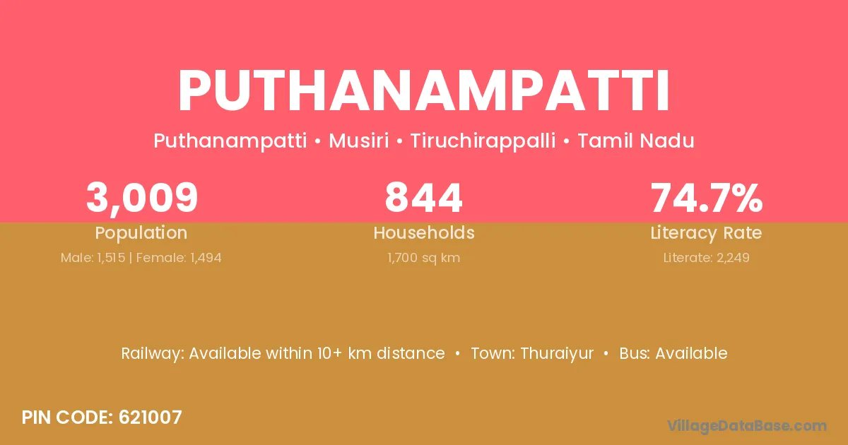 Puthanampatti village has a total population of 3,009 people, of which 1,515 are males and 1,494 are females.