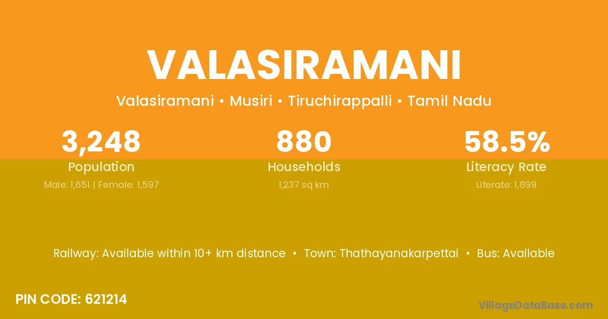 Valasiramani village has a total population of 3,248 people, of which 1,651 are males and 1,597 are females.