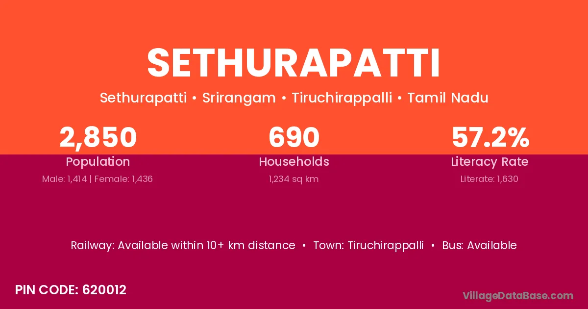 Sethurapatti village has a total population of 2,850 people, of which 1,414 are males and 1,436 are females.