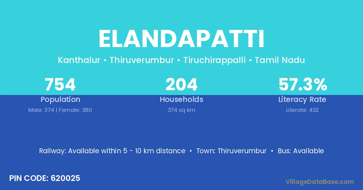 Elandapatti village has a total population of 754 people, of which 374 are males and 380 are females.