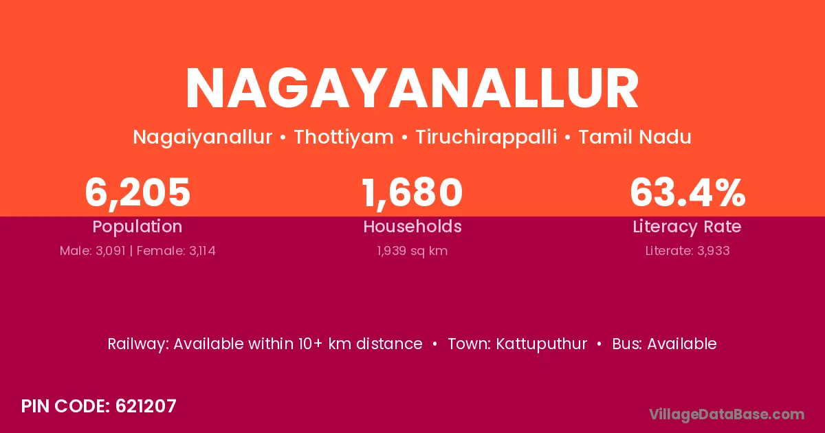 Nagayanallur village has a total population of 6,205 people, of which 3,091 are males and 3,114 are females.