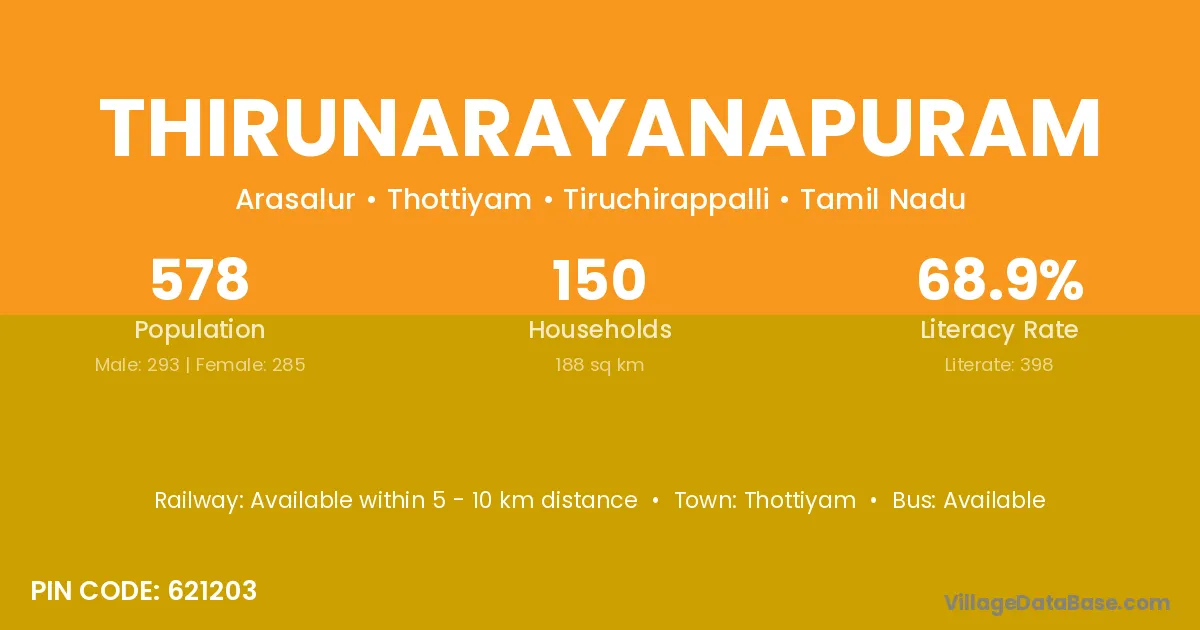 Thirunarayanapuram village has a total population of 578 people, of which 293 are males and 285 are females.