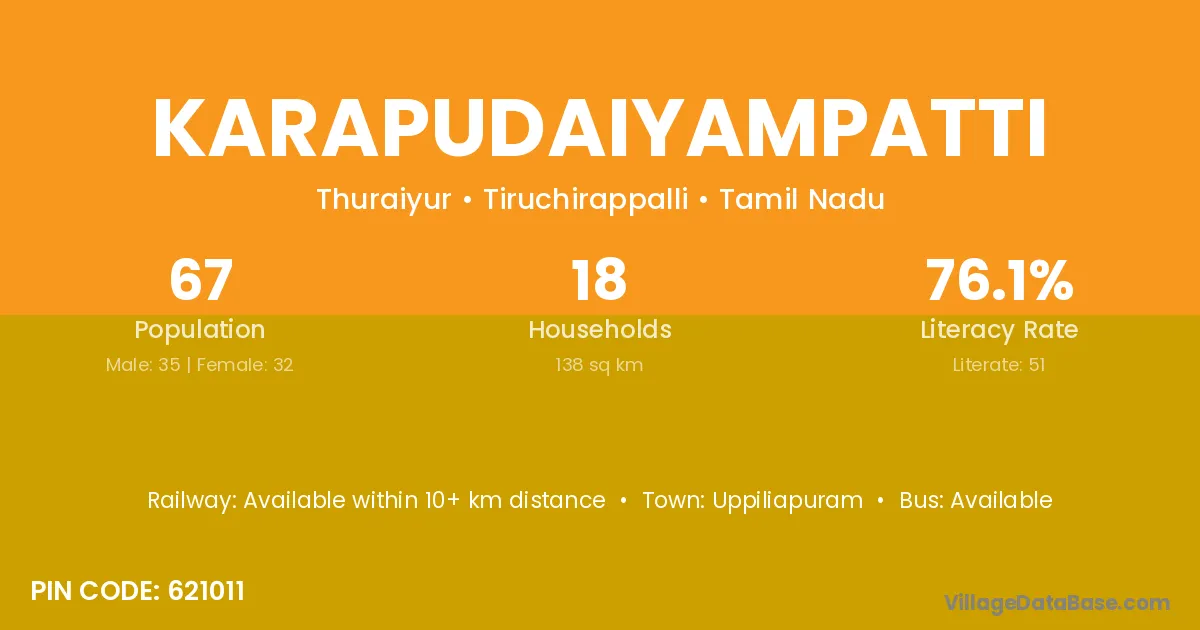 Karapudaiyampatti village has a total population of 67 people, of which 35 are males and 32 are females.