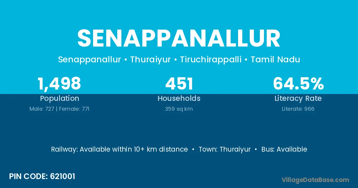 Senappanallur village has a total population of 1,498 people, of which 727 are males and 771 are females.