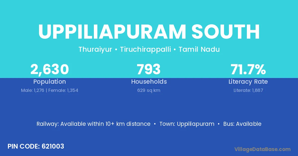 Uppiliapuram South village has a total population of 2,630 people, of which 1,276 are males and 1,354 are females.