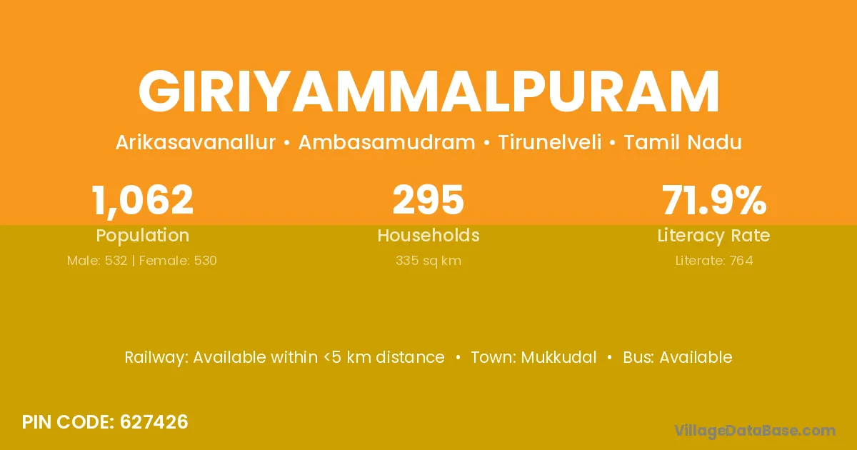 Giriyammalpuram village has a total population of 1,062 people, of which 532 are males and 530 are females.