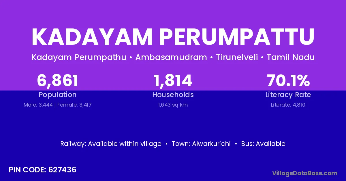 Kadayam Perumpattu village has a total population of 6,861 people, of which 3,444 are males and 3,417 are females.
