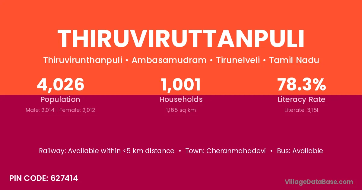 Cheranmahadevi is the nearest town to Thiruviruttanpuli village for major economic activities
