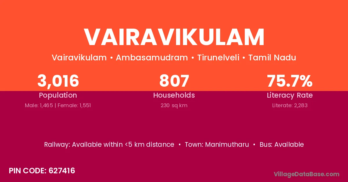 Vairavikulam village has a total population of 3,016 people, of which 1,465 are males and 1,551 are females.