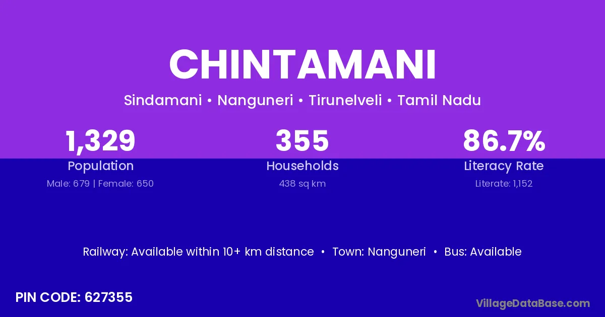 According to Census 2011 information, the village code of Chintamani village is 627355.