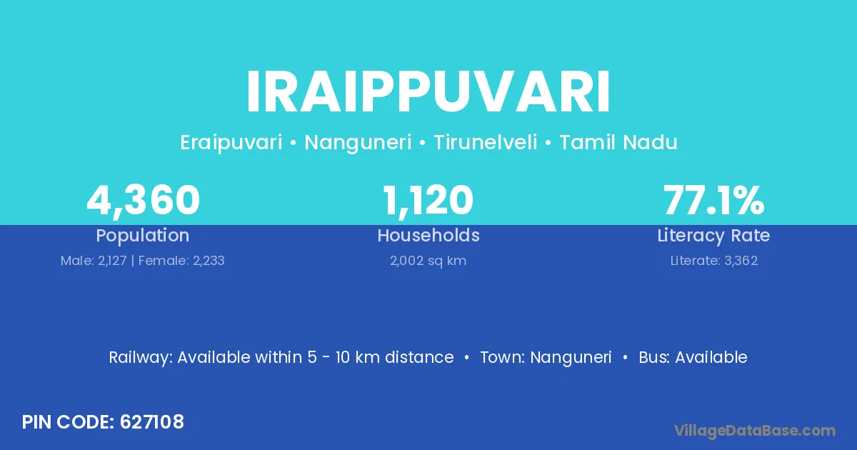 Iraippuvari village has a total population of 4,360 people, of which 2,127 are males and 2,233 are females.