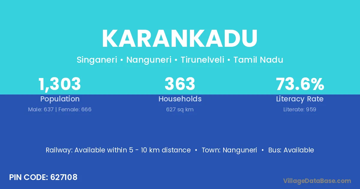 Karankadu village has a total population of 1,303 people, of which 637 are males and 666 are females.