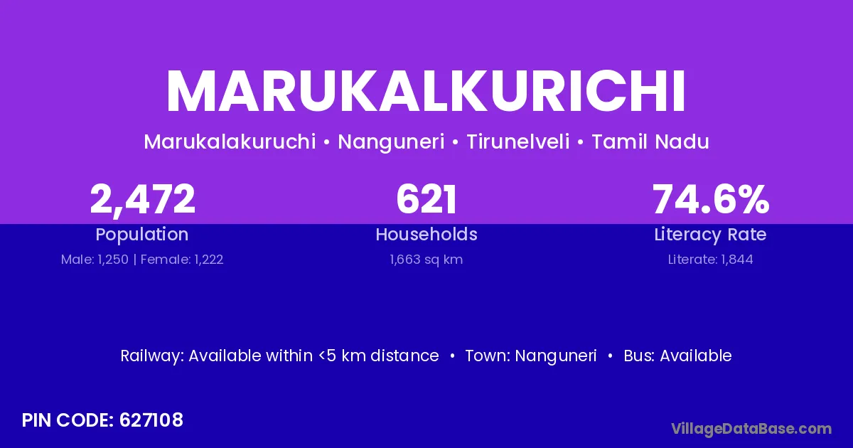 Marukalkurichi village has a total population of 2,472 people, of which 1,250 are males and 1,222 are females.