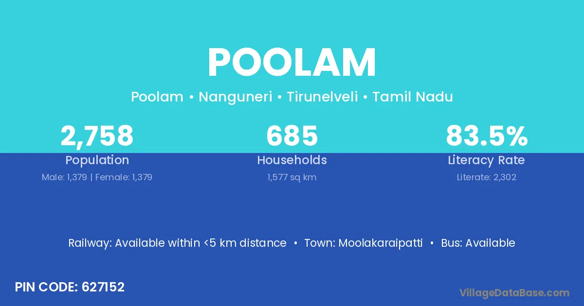 Poolam village has a total population of 2,758 people, of which 1,379 are males and 1,379 are females.