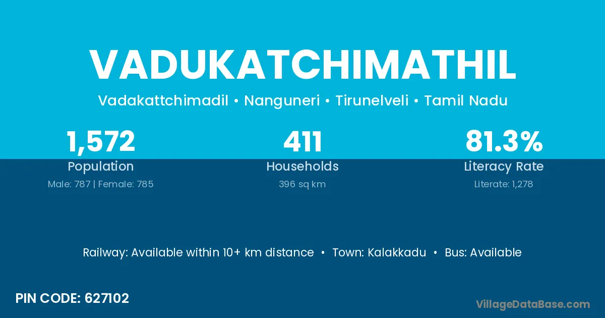 Vadukatchimathil village has a total population of 1,572 people, of which 787 are males and 785 are females.