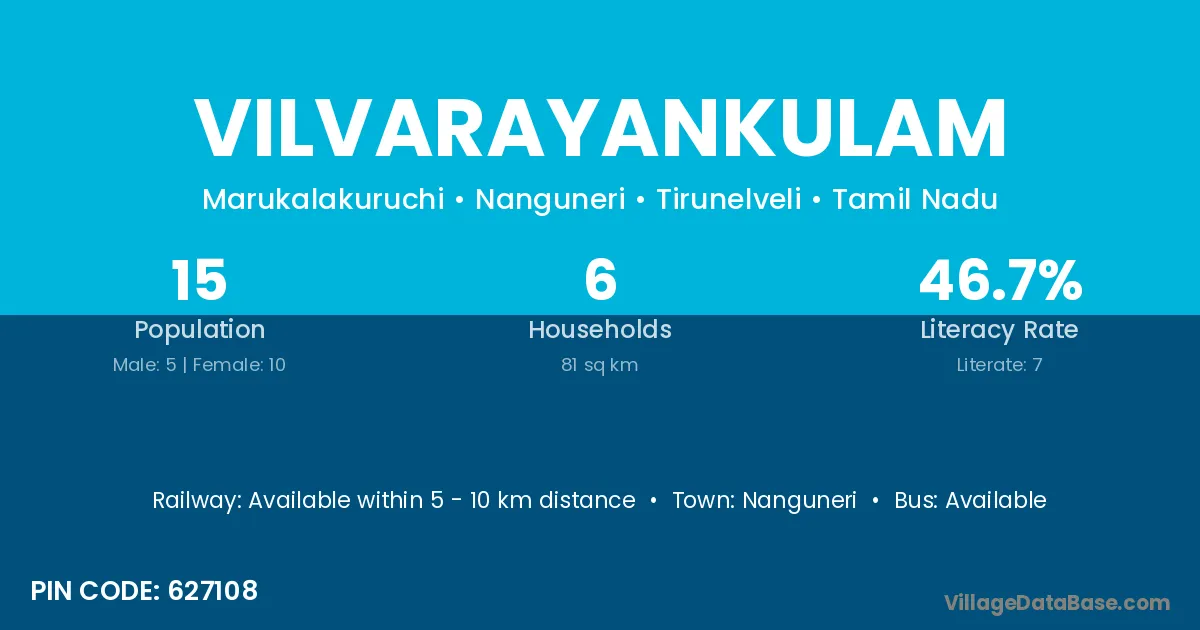 Vilvarayankulam village has a total population of 15 people, of which 5 are males and 10 are females.