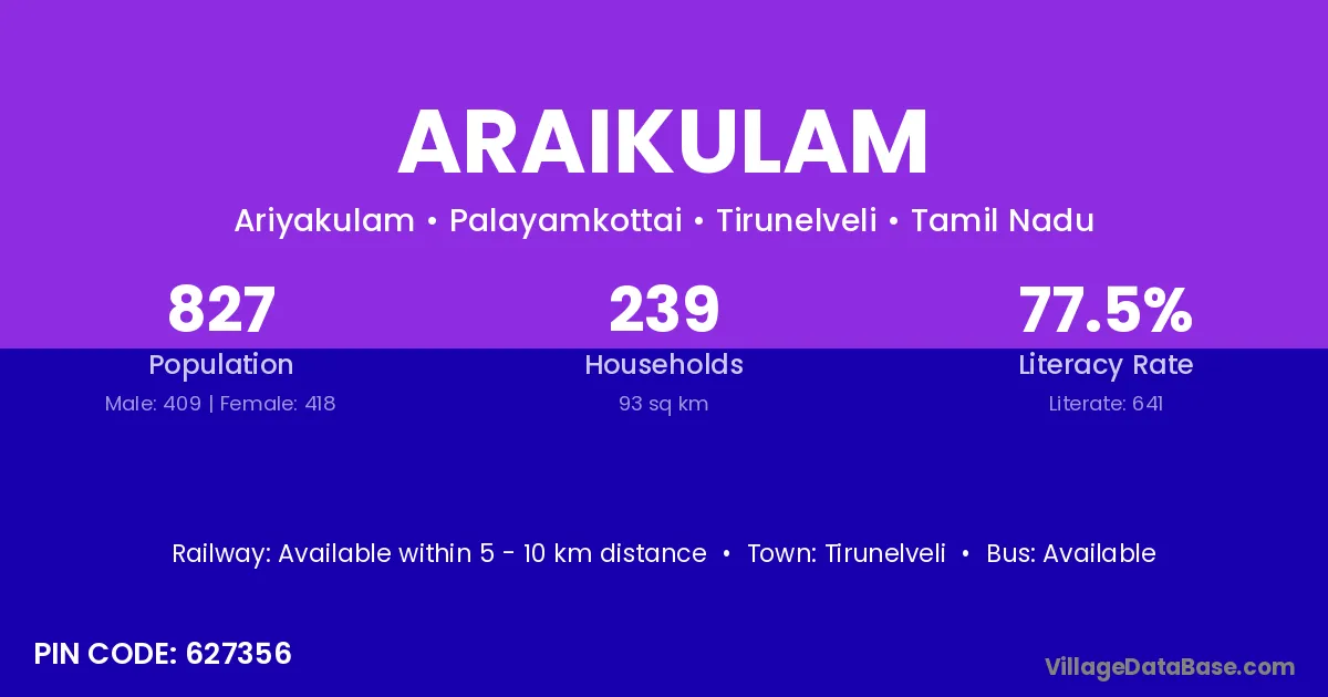 Araikulam village has a total population of 827 people, of which 409 are males and 418 are females.