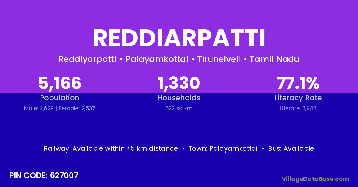 Palayamkottai is the nearest town to Reddiarpatti village for major economic activities