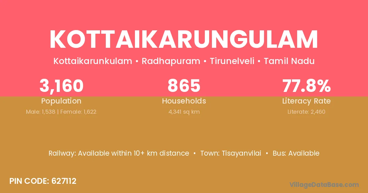 Kottaikarungulam village has a total population of 3,160 people, of which 1,538 are males and 1,622 are females.
