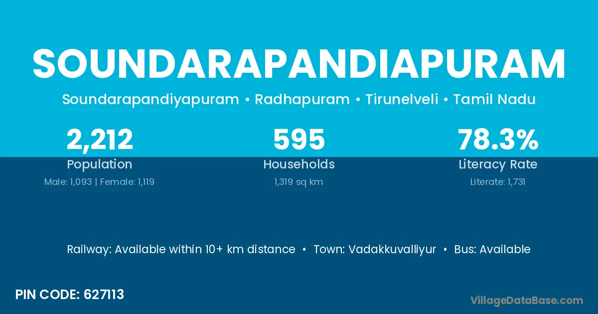 Soundarapandiapuram village has a total population of 2,212 people, of which 1,093 are males and 1,119 are females.