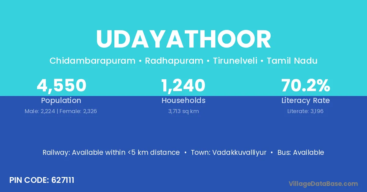 According to Census 2011 information, the village code of Udayathoor village is 627111.