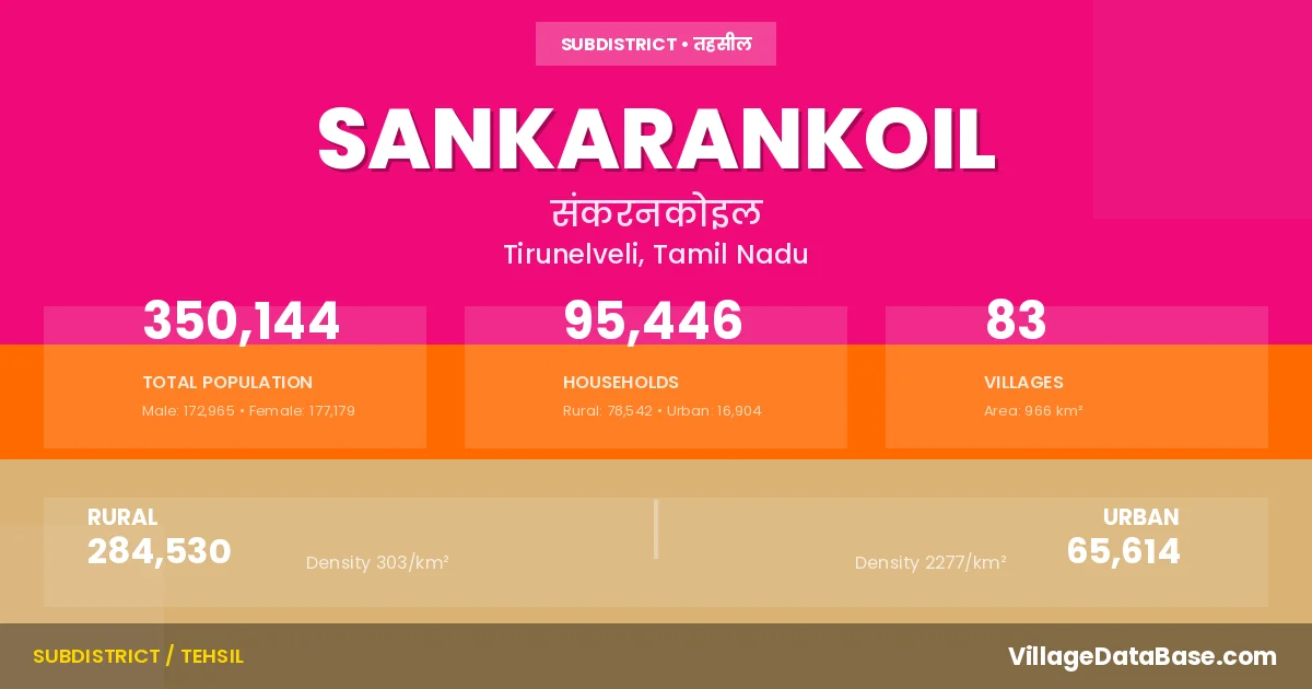 According to the 2011 census The total area of Sankarankoil Taluka is 966 km², with a population of 350144 people. The population density is 362 inhabitants per square kilometre, and there are approximately 95446 houses in the sub district.