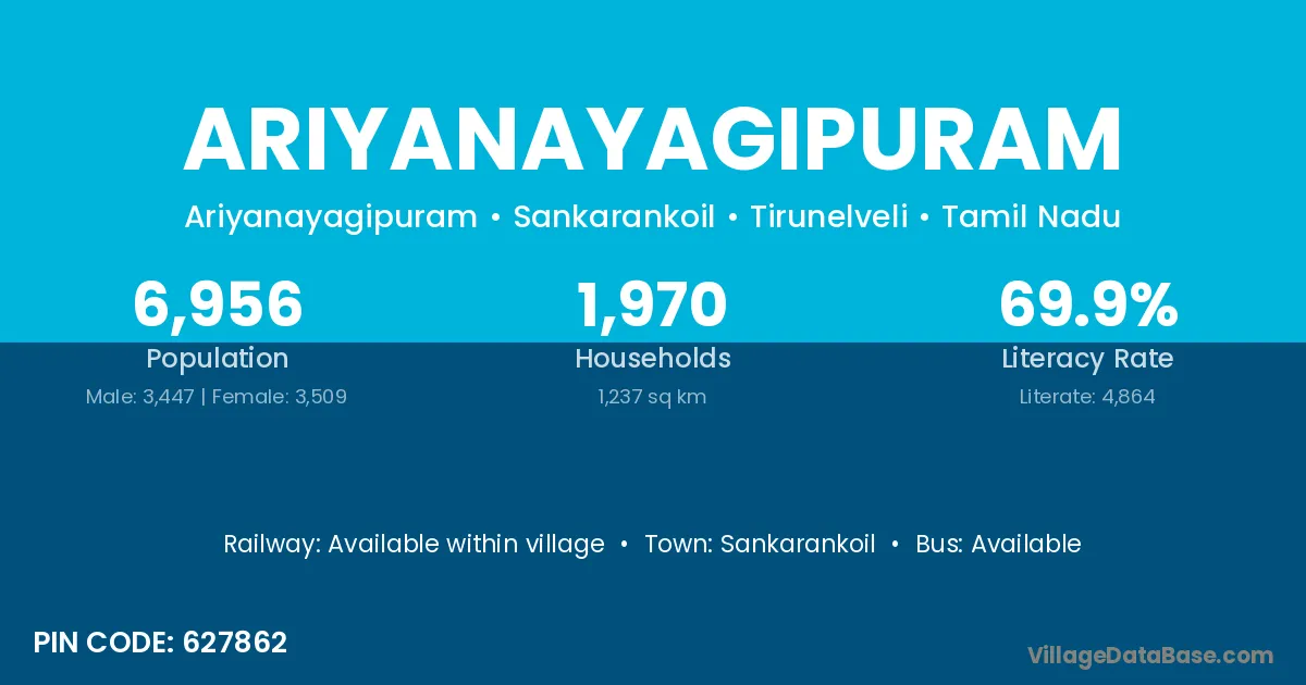 Ariyanayagipuram village has a total population of 6,956 people, of which 3,447 are males and 3,509 are females.