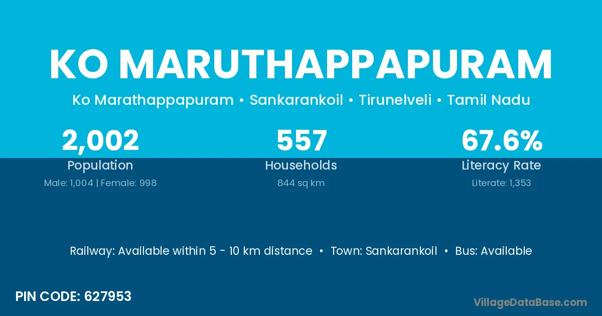 Ko Maruthappapuram village has a total population of 2,002 people, of which 1,004 are males and 998 are females.