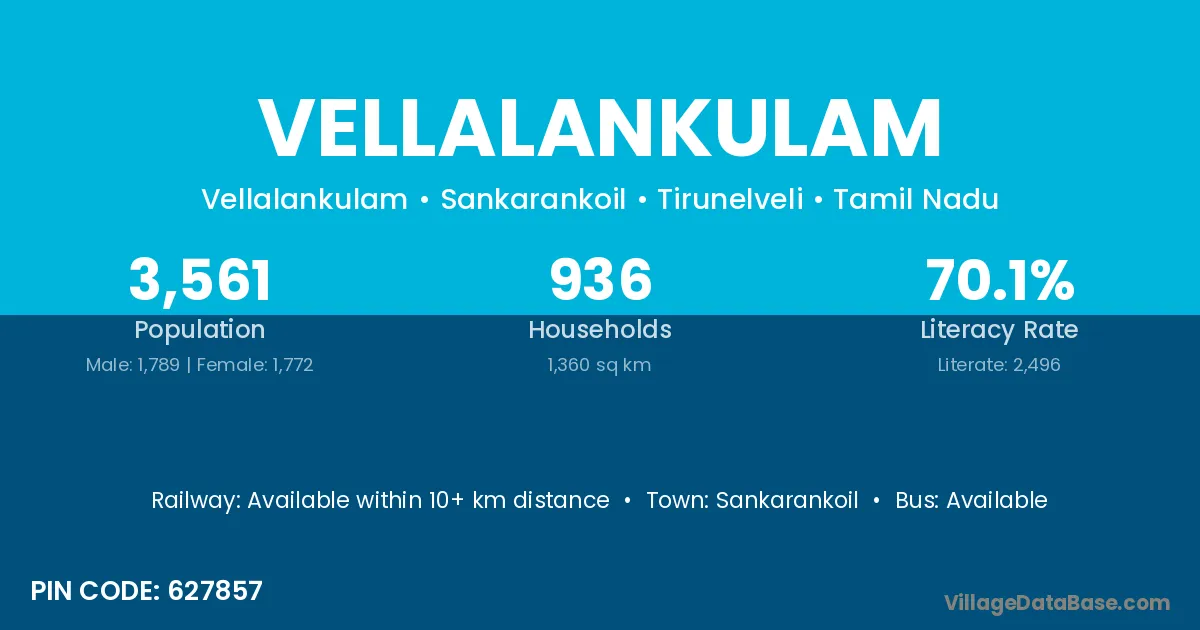 Vellalankulam village has a total population of 3,561 people, of which 1,789 are males and 1,772 are females.