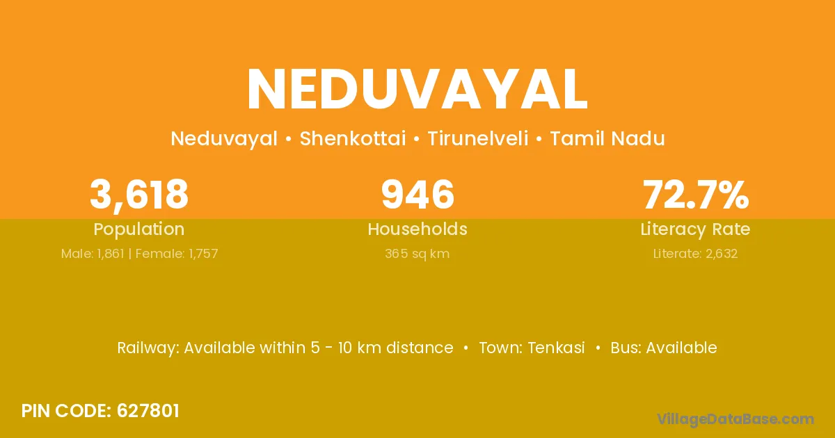 Neduvayal village has a total population of 3,618 people, of which 1,861 are males and 1,757 are females.
