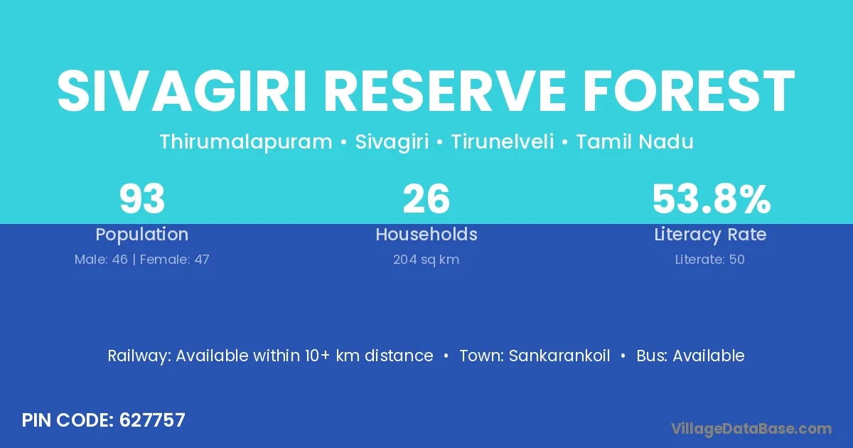 Sivagiri Reserve Forest village has a total population of 93 people, of which 46 are males and 47 are females.