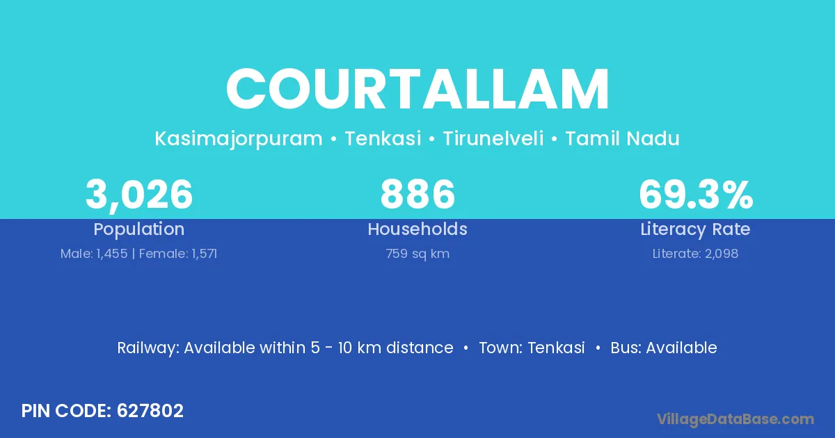 Courtallam village has a total population of 3,026 people, of which 1,455 are males and 1,571 are females.