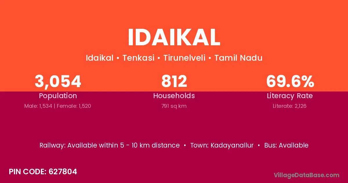 Kadayanallur is the nearest town to Idaikal village for major economic activities