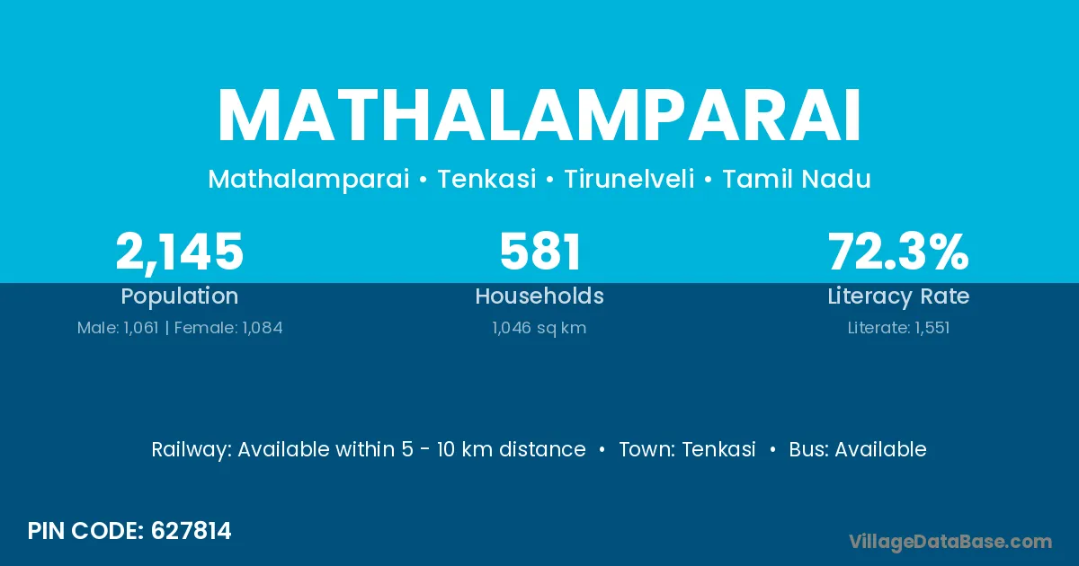 Mathalamparai village has a total population of 2,145 people, of which 1,061 are males and 1,084 are females.