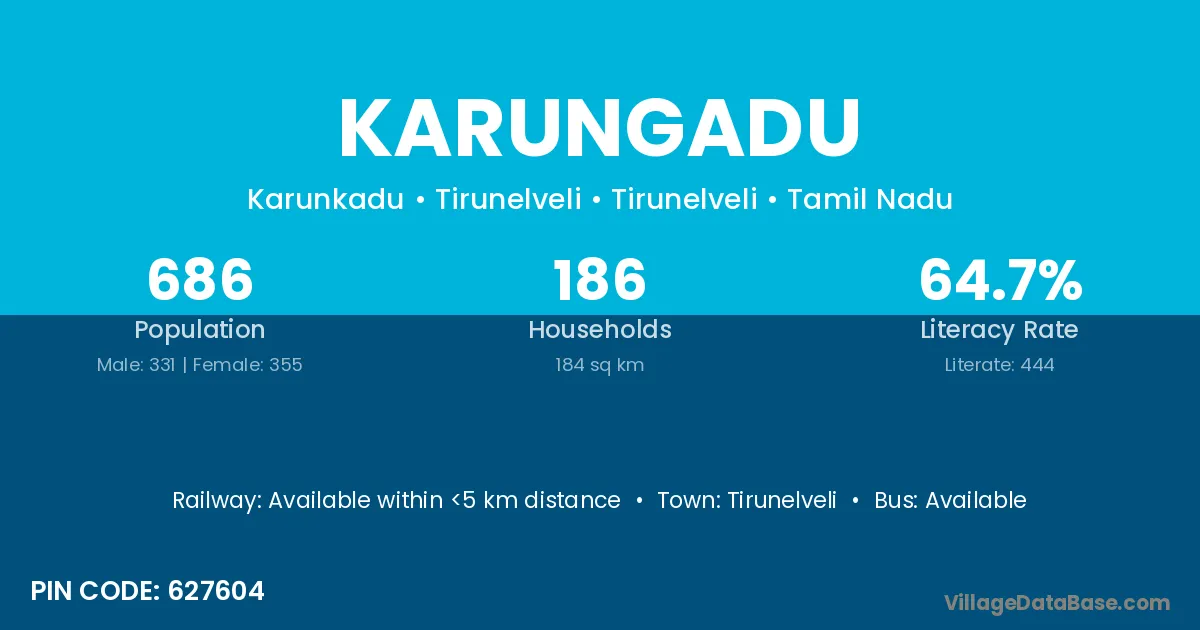 According to Census 2011 information, the village code of Karungadu village is 627604.