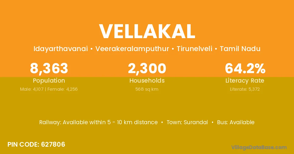 Vellakal village has a total population of 8,363 people, of which 4,107 are males and 4,256 are females.