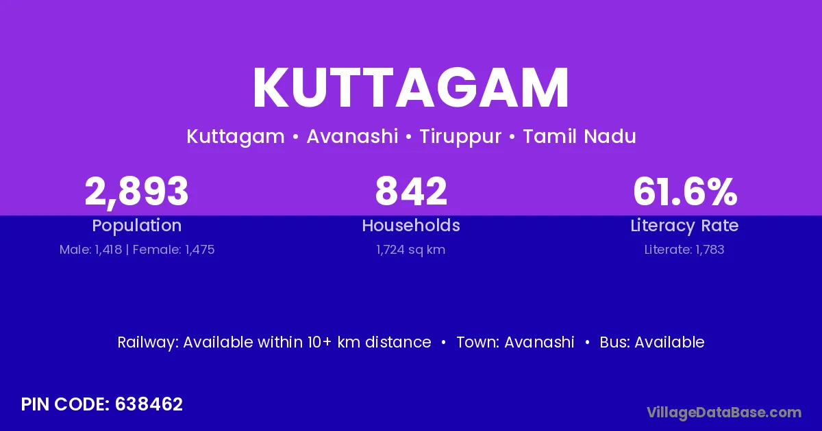 Kuttagam village has a total population of 2,893 people, of which 1,418 are males and 1,475 are females.