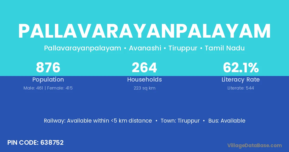 Pallavarayanpalayam village has a total population of 876 people, of which 461 are males and 415 are females.