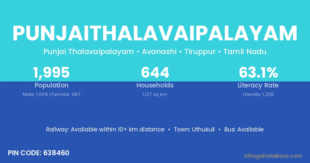 Punjaithalavaipalayam village has a total population of 1,995 people, of which 1,008 are males and 987 are females.
