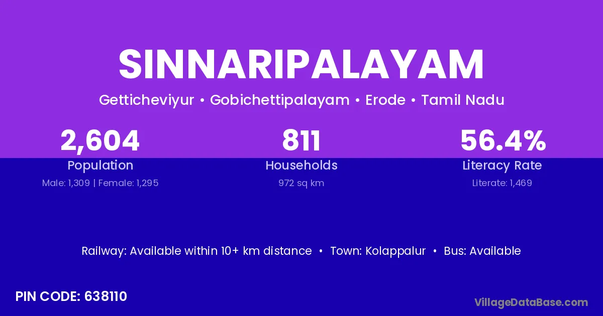 Sinnaripalayam village has a total population of 2,433 people, of which 1,250 are males and 1,183 are females.
