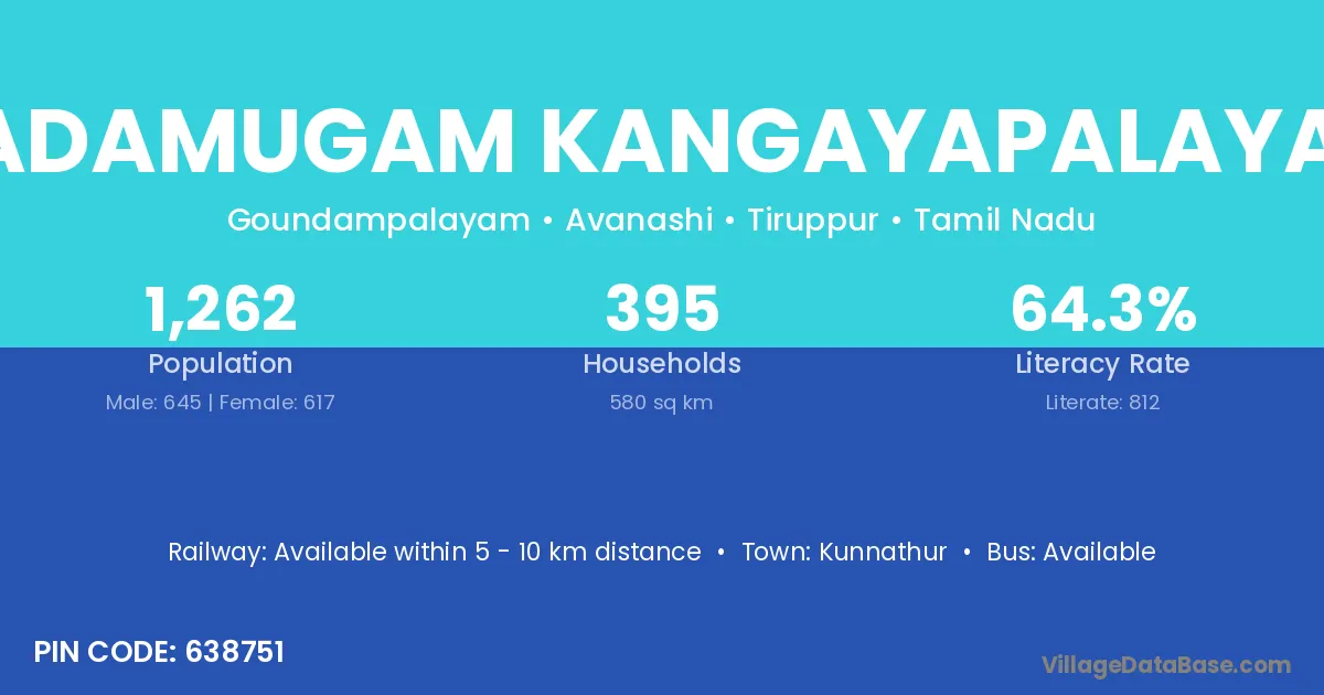 Vadamugam Kangayapalayam village has a total population of 1,262 people, of which 645 are males and 617 are females.